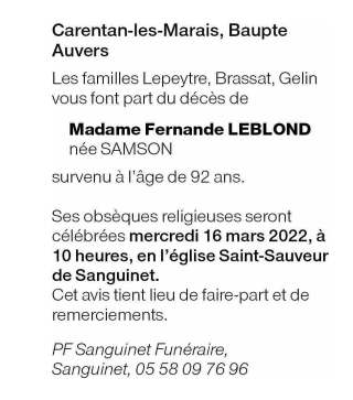 Veuve de Monsieur Roger Marc Louis LEBLOND